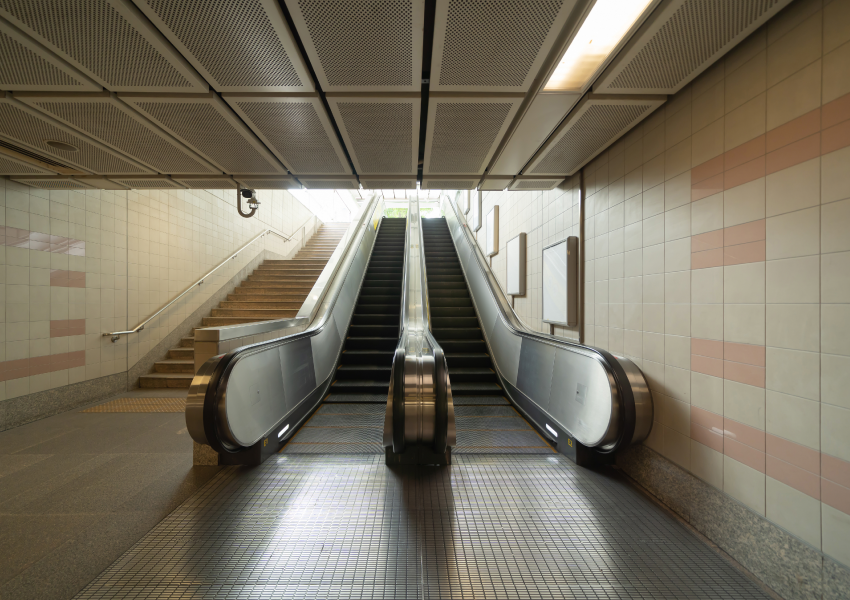 Escalators are efficient, continuous step systems that smoothly transport people between different building levels.