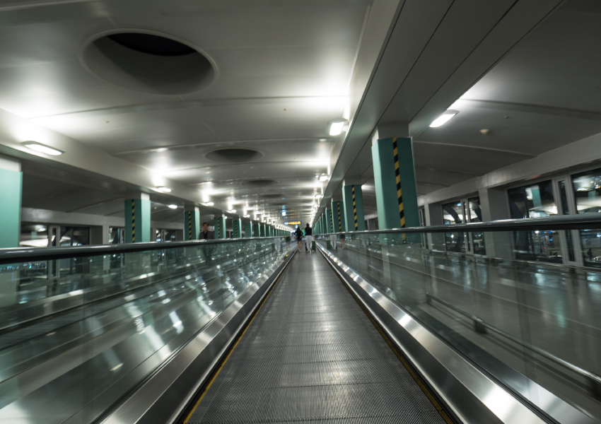 A moving walk is a conveyor system that transports people over short to medium distances, typically in airports or malls.